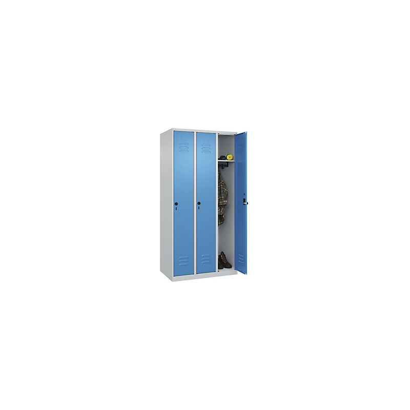 Armadietto Classic PLUS, 3 scomparti, grigio chiaro / blu chiaro, largh. 900 mm, con piedini a pavimento, serratura girevole. Fornitura = montato. Altezza = 1850 mm. Profondità = 500 mm. Larghezza = 900 mm. Colore corpo = grigio chiaro RAL 7035. Colore porta = blu chiaro RAL 5012. Serratura = chiavistello girevole. Numero scomparti in larghezza = 3 pz. Larghezza scomparti = 300 mm. Materiale = acciaio. Dotazione interna = 1 asta appendiabiti con 3 ganci e 1 ripiano per scomparto. Altezza interna = 1787 mm. Profondità interna = 477 mm. Tipo di porta = anta a battente. Superficie = verniciatura. Frontali con fessure di areazione per una ventilazione ancora più efficace. Profili laterali delle ante chiusi per un'elevata resistenza alla torsione. Corpo con aperture di ventilazione nella parte superiore e inferiore per una circolazione ottimale dell'aria. Personalizzabili con piedini, zoccolino e piedini a pavimento. Ideali per l'industria e la produzione, società sportive e università.