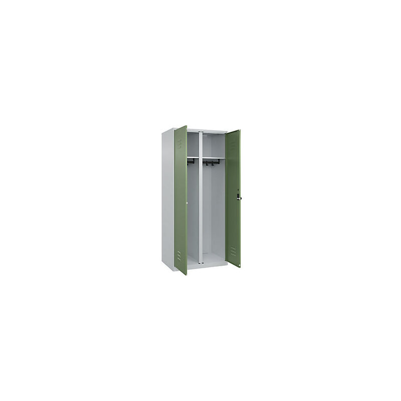 Armadietto bianco e nero Classic PLUS, 1 scomparto, grigio chiaro / verde reseda, alt. x largh. 1850 x 800 mm, con piedini a pavimento, serratura girevole. Fornitura = montato. Altezza = 1850 mm. Profondità = 500 mm. Larghezza = 800 mm. Colore corpo = grigio chiaro RAL 7035. Colore porta = verde reseda RAL 6011. Serratura = chiavistello girevole. Numero scomparti in larghezza = 1 pz. Larghezza scomparti = 400 mm. Materiale = acciaio. Dotazione interna = 2 aste appendiabiti con 4 ganci, 2 ripiani. Altezza interna = 1787 mm. Profondità interna = 477 mm. Tipo di porta = anta a battente. Superficie = verniciatura. Frontali con fessure di areazione per una ventilazione ancora più efficace. Profili laterali delle ante chiusi per un'elevata resistenza alla torsione. Ante a battente con serratura unica. Corpo con aperture di ventilazione nella parte superiore e inferiore per una circolazione ottimale dell'aria. Personalizzabili con piedini, zoccolino e piedini a pavimento. Separazione sicura e