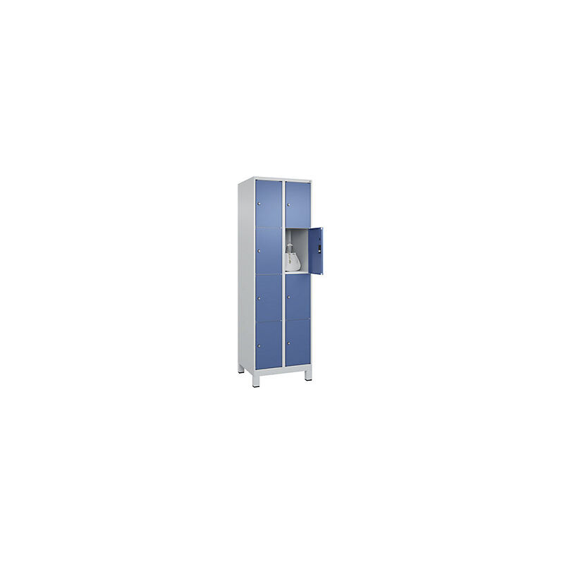 Armadio a scomparti Classic PLUS, 2 scomparti, grigio chiaro / indaco, largh. 600 mm, 8 scomparti, con piedini. Fornitura = montato. Altezza = 1950 mm. Profondità = 500 mm. Larghezza = 600 mm. Colore corpo = grigio chiaro RAL 7035. Colore porta = indaco RAL 5023. Serratura = serratura a cilindro. Numero scomparti in larghezza = 2 pz. Numero scomparti = 8 pz. Larghezza scomparti = 300 mm. Materiale = acciaio. Profondità interna = 477 mm. Tipo di porta = anta a battente. Numero chiavi = 2 pz. Altezza zoccolo = 100 mm. Superficie = verniciatura. Profili laterali delle ante chiusi per un'elevata resistenza alla torsione. Pratici armadi a scomparti per riporre oggetti personali, per maggiore ordine e sicurezza. Personalizzabili con piedini, zoccolino e piedini a pavimento. Ideali per magazzini, officine, società sportive, strutture pubbliche ecc. L'armadio a scomparti Classic PLUS convince per la sua struttura robusta e le sue versatili opzioni di allestimento. L'armadio ha una robusta