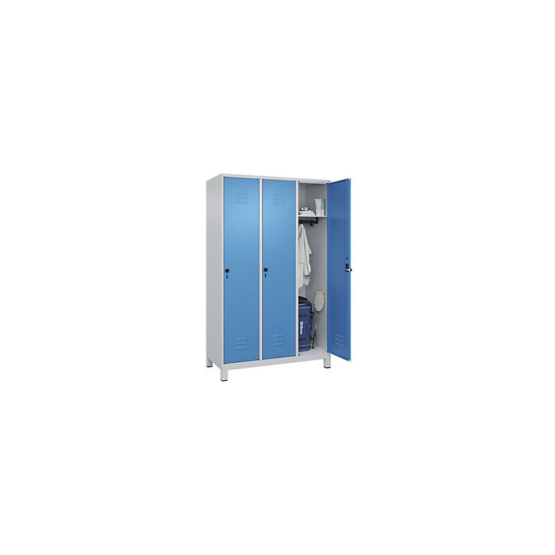 Armadietto Classic PLUS, 3 scomparti, grigio chiaro / blu chiaro, largh. 1200 mm, con piedini, serratura girevole. Fornitura = montato. Altezza = 1950 mm. Profondità = 500 mm. Larghezza = 1200 mm. Colore corpo = grigio chiaro RAL 7035. Colore porta = blu chiaro RAL 5012. Serratura = chiavistello girevole. Numero scomparti in larghezza = 3 pz. Larghezza scomparti = 400 mm. Materiale = acciaio. Dotazione interna = 1 asta appendiabiti con 3 ganci e 1 ripiano per scomparto. Altezza interna = 1787 mm. Profondità interna = 477 mm. Tipo di porta = anta a battente. Altezza zoccolo = 100 mm. Superficie = verniciatura. Frontali con fessure di areazione per una ventilazione ancora più efficace. Profili laterali delle ante chiusi per un'elevata resistenza alla torsione. Corpo con aperture di ventilazione nella parte superiore e inferiore per una circolazione ottimale dell'aria. Personalizzabili con piedini, zoccolino e piedini a pavimento. Ideali per l'industria e la produzione, società sportive e
