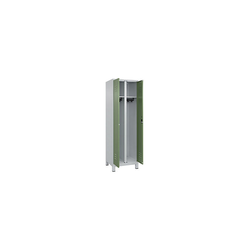 Armadietto bianco e nero Classic PLUS, 1 scomparto, grigio chiaro / verde reseda, alt. x largh. 1950 x 600 mm, con piedini, serratura a cilindro. Fornitura = montato. Altezza = 1950 mm. Profondità = 500 mm. Larghezza = 600 mm. Colore corpo = grigio chiaro RAL 7035. Colore porta = verde reseda RAL 6011. Serratura = serratura a cilindro. Numero scomparti in larghezza = 1 pz. Larghezza scomparti = 300 mm. Materiale = acciaio. Dotazione interna = 2 aste appendiabiti con 3 ganci, 2 ripiani. Altezza interna = 1787 mm. Profondità interna = 477 mm. Tipo di porta = anta a battente. Numero chiavi = 2 pz. Altezza zoccolo = 100 mm. Superficie = verniciatura. Frontali con fessure di areazione per una ventilazione ancora più efficace. Profili laterali delle ante chiusi per un'elevata resistenza alla torsione. Ante a battente con serratura unica. Corpo con aperture di ventilazione nella parte superiore e inferiore per una circolazione ottimale dell'aria. Personalizzabili con piedini, zoccolino e
