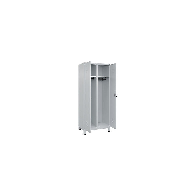 Armadietto bianco e nero Classic PLUS, 1 scomparto, grigio chiaro, alt. x largh. 1950 x 800 mm, con piedini, serratura girevole. Fornitura = montato. Altezza = 1950 mm. Profondità = 500 mm. Larghezza = 800 mm. Colore corpo = grigio chiaro RAL 7035. Colore porta = grigio chiaro RAL 7035. Serratura = chiavistello girevole. Numero scomparti in larghezza = 1 pz. Larghezza scomparti = 400 mm. Materiale = acciaio. Dotazione interna = 2 aste appendiabiti con 4 ganci, 2 ripiani. Altezza interna = 1787 mm. Profondità interna = 477 mm. Tipo di porta = anta a battente. Altezza zoccolo = 100 mm. Superficie = verniciatura. Frontali con fessure di areazione per una ventilazione ancora più efficace. Profili laterali delle ante chiusi per un'elevata resistenza alla torsione. Ante a battente con serratura unica. Corpo con aperture di ventilazione nella parte superiore e inferiore per una circolazione ottimale dell'aria. Personalizzabili con piedini, zoccolino e piedini a pavimento. Separazione sicura e