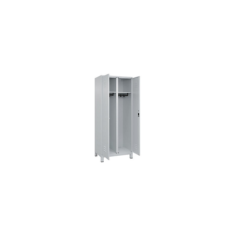 Armadietto bianco e nero Classic PLUS, 1 scomparto, grigio chiaro, alt. x largh. 1950 x 800 mm, con piedini, serratura a cilindro. Fornitura = montato. Altezza = 1950 mm. Profondità = 500 mm. Larghezza = 800 mm. Colore corpo = grigio chiaro RAL 7035. Colore porta = grigio chiaro RAL 7035. Serratura = serratura a cilindro. Numero scomparti in larghezza = 1 pz. Larghezza scomparti = 400 mm. Materiale = acciaio. Dotazione interna = 2 aste appendiabiti con 4 ganci, 2 ripiani. Altezza interna = 1787 mm. Profondità interna = 477 mm. Tipo di porta = anta a battente. Numero chiavi = 2 pz. Altezza zoccolo = 100 mm. Superficie = verniciatura. Frontali con fessure di areazione per una ventilazione ancora più efficace. Profili laterali delle ante chiusi per un'elevata resistenza alla torsione. Ante a battente con serratura unica. Corpo con aperture di ventilazione nella parte superiore e inferiore per una circolazione ottimale dell'aria. Personalizzabili con piedini, zoccolino e piedini a