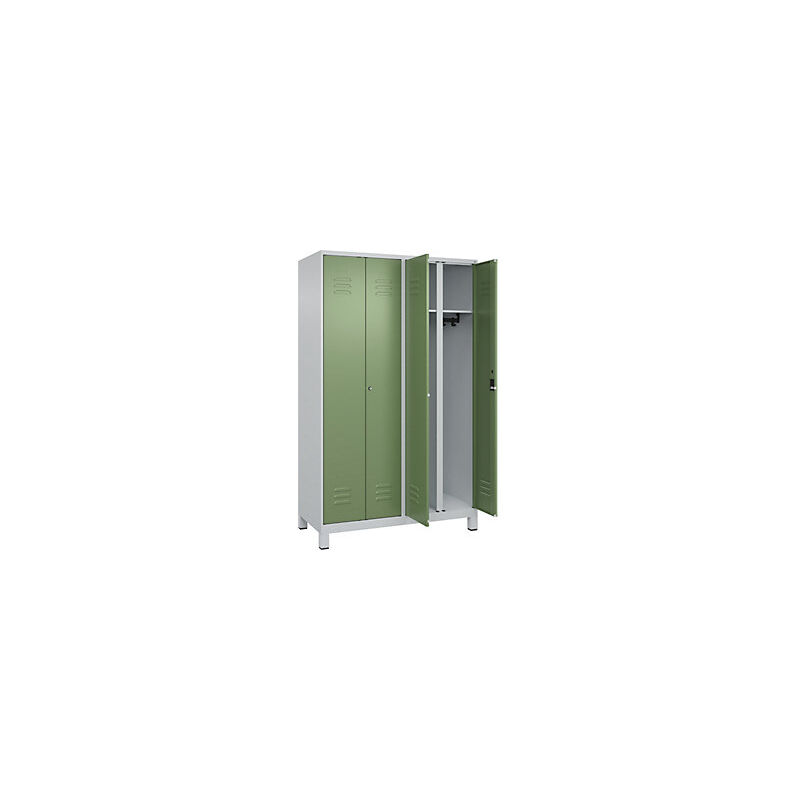 Armadietto bianco e nero Classic PLUS, 2 scomparti, grigio chiaro / verde reseda, alt. x largh. 1950 x 1200 mm, con piedini, serratura a cilindro. Fornitura = montato. Altezza = 1950 mm. Profondità = 500 mm. Larghezza = 1200 mm. Colore corpo = grigio chiaro RAL 7035. Colore porta = verde reseda RAL 6011. Serratura = serratura a cilindro. Numero scomparti in larghezza = 2 pz. Larghezza scomparti = 300 mm. Materiale = acciaio. Dotazione interna = 4 aste appendiabiti con 3 ganci, 4 ripiani. Altezza interna = 1787 mm. Profondità interna = 477 mm. Tipo di porta = anta a battente. Numero chiavi = 2 pz. Altezza zoccolo = 100 mm. Superficie = verniciatura. Frontali con fessure di areazione per una ventilazione ancora più efficace. Profili laterali delle ante chiusi per un'elevata resistenza alla torsione. Ante a battente con serratura unica. Corpo con aperture di ventilazione nella parte superiore e inferiore per una circolazione ottimale dell'aria. Personalizzabili con piedini, zoccolino e