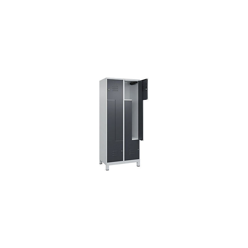 Armadietto a Z Classic PLUS, 2 scomparti, grigio chiaro / grigio, largh. 800 mm, con piedini, serratura a cilindro. Fornitura = montato. Altezza = 1950 mm. Profondità = 500 mm. Larghezza = 800 mm. Colore corpo = grigio chiaro RAL 7035. Colore porta = grigio antracite RAL 7016. Serratura = serratura a cilindro. Numero scomparti in larghezza = 2 pz. Numero scomparti = 4 pz. Larghezza scomparti = 200/400 mm. Materiale = acciaio. Dotazione interna = 1 asta appendiabiti con 4 ganci per scomparto. Altezza interna = 1787 mm. Profondità interna = 477 mm. Numero chiavi = 2 pz. Altezza zoccolo = 100 mm. Superficie = verniciatura. Frontali con fessure di areazione per una ventilazione ancora più efficace. Profili laterali delle ante chiusi per un'elevata resistenza alla torsione. Corpo con aperture di ventilazione nella parte superiore e inferiore per una circolazione ottimale dell'aria. Armadietti a forma di Z per appendere capi di abbigliamento lunghi con un ingombro ridotto nella stanza.