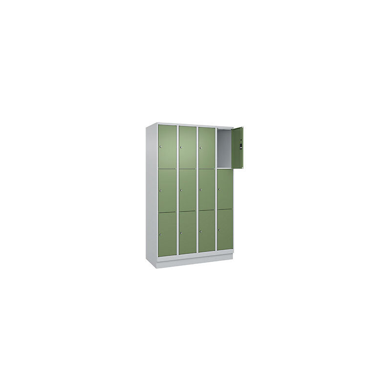Armadio a scomparti Classic PLUS, 4 scomparti, grigio chiaro / verde reseda, largh. 1200 mm, 12 scomparti, con zoccolino. Fornitura = montato. Altezza = 1950 mm. Profondità = 500 mm. Larghezza = 1200 mm. Colore corpo = grigio chiaro RAL 7035. Colore porta = verde reseda RAL 6011. Serratura = serratura a cilindro. Numero scomparti in larghezza = 4 pz. Numero scomparti = 12 pz. Larghezza scomparti = 300 mm. Materiale = acciaio. Profondità interna = 477 mm. Tipo di porta = anta a battente. Numero chiavi = 2 pz. Altezza zoccolo = 100 mm. Superficie = verniciatura. Profili laterali delle ante chiusi per un'elevata resistenza alla torsione. Pratici armadi a scomparti per riporre oggetti personali, per maggiore ordine e sicurezza. Personalizzabili con piedini, zoccolino e piedini a pavimento. Ideali per magazzini, officine, società sportive, strutture pubbliche ecc. L'armadio a scomparti Classic PLUS convince per la sua struttura robusta e le sue versatili opzioni di allestimento. L'armadio
