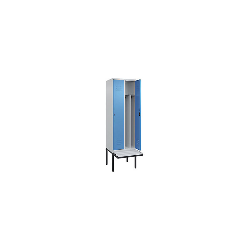Armadietto Classic PLUS con panca, 2 scomparti, tramezza centrale, grigio chiaro / blu chiaro, largh. 600 mm, serratura a cilindro, panca sporgente, plastica. Fornitura = montato. Altezza = 2120 mm. Larghezza = 600 mm. Profondità = 815 mm. Colore corpo = grigio chiaro RAL 7035. Colore porta = blu chiaro RAL 5012. Serratura = serratura a cilindro. Numero scomparti in larghezza = 2 pz. Materiale = acciaio. Larghezza scomparti = 300 mm. Dotazione interna = 2 aste appendiabiti con 2 ganci e 1 ripiano per scomparto. Altezza sedile = 450 mm. Profondità sedile = 310 mm. Altezza zoccolo = 420 mm. Altezza armadio = 1175 mm. Versione = con panca. Serie = CLASSIC PLUS. Altezza interna = 1637 mm. Separazione compatta e salvaspazio di abbigliamento privato e da lavoro. Ideali per l'industria e la produzione, laboratori, il settore della ristorazione e sanitario. Possibilità di regolazione per la messa in piano su superfici irregolari. Frontali con fessure di areazione per una ventilazione ancora