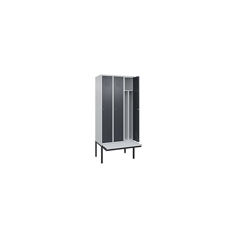 Armadietto Classic PLUS con panca, 3 scomparti, tramezza centrale, grigio chiaro / grigio, largh. 900 mm, serratura a cilindro, panca sporgente, plastica. Fornitura = montato. Altezza = 2120 mm. Larghezza = 900 mm. Profondità = 815 mm. Colore corpo = grigio chiaro RAL 7035. Colore porta = grigio antracite RAL 7016. Serratura = serratura a cilindro. Numero scomparti in larghezza = 3 pz. Materiale = acciaio. Larghezza scomparti = 300 mm. Dotazione interna = 2 aste appendiabiti con 2 ganci e 1 ripiano per scomparto. Altezza sedile = 450 mm. Profondità sedile = 310 mm. Altezza zoccolo = 420 mm. Altezza armadio = 1175 mm. Versione = con panca. Serie = CLASSIC PLUS. Altezza interna = 1637 mm. Separazione compatta e salvaspazio di abbigliamento privato e da lavoro. Ideali per l'industria e la produzione, laboratori, il settore della ristorazione e sanitario. Possibilità di regolazione per la messa in piano su superfici irregolari. Frontali con fessure di areazione per una ventilazione ancora