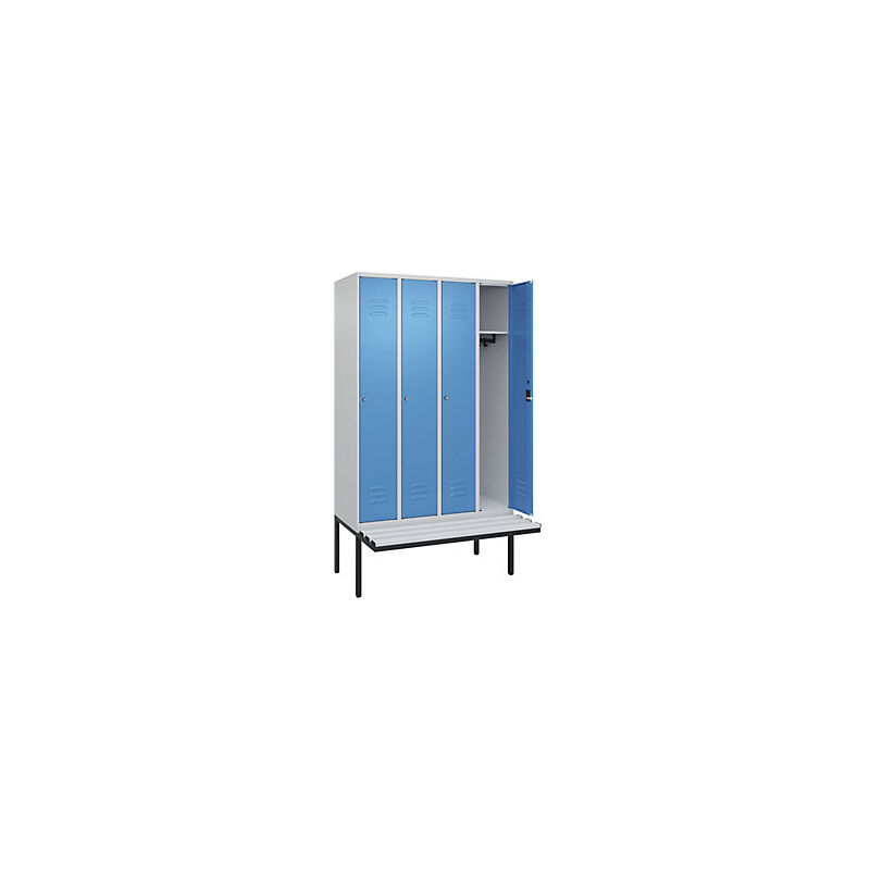 Armadietto Classic PLUS con panca, 4 scomparti, grigio chiaro / blu chiaro, largh. 1200 mm, serratura a cilindro, panca sporgente, plastica. Fornitura = montato. Altezza = 2120 mm. Larghezza = 1200 mm. Profondità = 815 mm. Colore corpo = grigio chiaro RAL 7035. Colore porta = blu chiaro RAL 5012. Serratura = serratura a cilindro. Numero scomparti in larghezza = 4 pz. Materiale = acciaio. Larghezza scomparti = 300 mm. Dotazione interna = 1 asta appendiabiti con 3 ganci e 1 ripiano per scomparto. Altezza sedile = 450 mm. Profondità sedile = 310 mm. Altezza zoccolo = 420 mm. Altezza armadio = 1175 mm. Versione = con panca. Serie = CLASSIC PLUS. Altezza interna = 1637 mm. Ideali per l'industria e la produzione, società sportive e università. Possibilità di regolazione per la messa in piano su superfici irregolari. Frontali con fessure di areazione per una ventilazione ancora più efficace. Profili laterali delle ante chiusi per un'elevata resistenza alla torsione. Corpo con aperture di