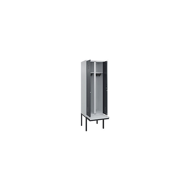 Armadietto bianco e nero Classic PLUS con panca, 1 scomparto, grigio chiaro / grigio, largh. 600 mm, serratura a cilindro, panca sporgente, plastica. Fornitura = montato. Altezza = 2120 mm. Larghezza = 600 mm. Profondità = 815 mm. Colore corpo = grigio chiaro RAL 7035. Colore porta = grigio antracite RAL 7016. Serratura = serratura a cilindro. Numero scomparti in larghezza = 1 pz. Materiale = acciaio. Larghezza scomparti = 300 mm. Dotazione interna = 2 aste appendiabiti con 3 ganci, 2 ripiani. Altezza sedile = 450 mm. Profondità sedile = 310 mm. Altezza zoccolo = 420 mm. Altezza armadio = 1175 mm. Versione = con panca. Serie = CLASSIC PLUS. Altezza interna = 1637 mm. Possibilità di regolazione per la messa in piano su superfici irregolari. Frontali con fessure di areazione per una ventilazione ancora più efficace. Profili laterali delle ante chiusi per un'elevata resistenza alla torsione. Ante a battente con serratura unica. Corpo con aperture di ventilazione nella parte superiore e