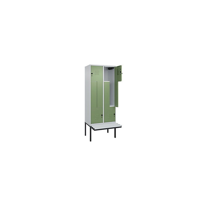 Armadietto a Z Classic PLUS con panca, 2 scomparti, grigio chiaro / verde reseda, largh. 800 mm, serratura girevole di sicurezza, panca sporgente, plastica. Fornitura = montato. Altezza = 2120 mm. Larghezza = 800 mm. Profondità = 815 mm. Colore corpo = grigio chiaro RAL 7035. Colore porta = verde reseda RAL 6011. Serratura = chiavistello girevole di sicurezza. Numero scomparti in larghezza = 2 pz. Numero scomparti = 4 pz. Materiale = acciaio. Larghezza scomparti = 150/300 mm. Dotazione interna = 1 asta appendiabiti con 4 ganci per scomparto. Altezza sedile = 450 mm. Profondità sedile = 310 mm. Altezza zoccolo = 420 mm. Altezza armadio = 1079 mm. Serie = CLASSIC PLUS. Altezza interna = 1637 mm. Possibilità di regolazione per la messa in piano su superfici irregolari. Frontali con fessure di areazione per una ventilazione ancora più efficace. Profili laterali delle ante chiusi per un'elevata resistenza alla torsione. Corpo con aperture di ventilazione nella parte superiore e inferiore