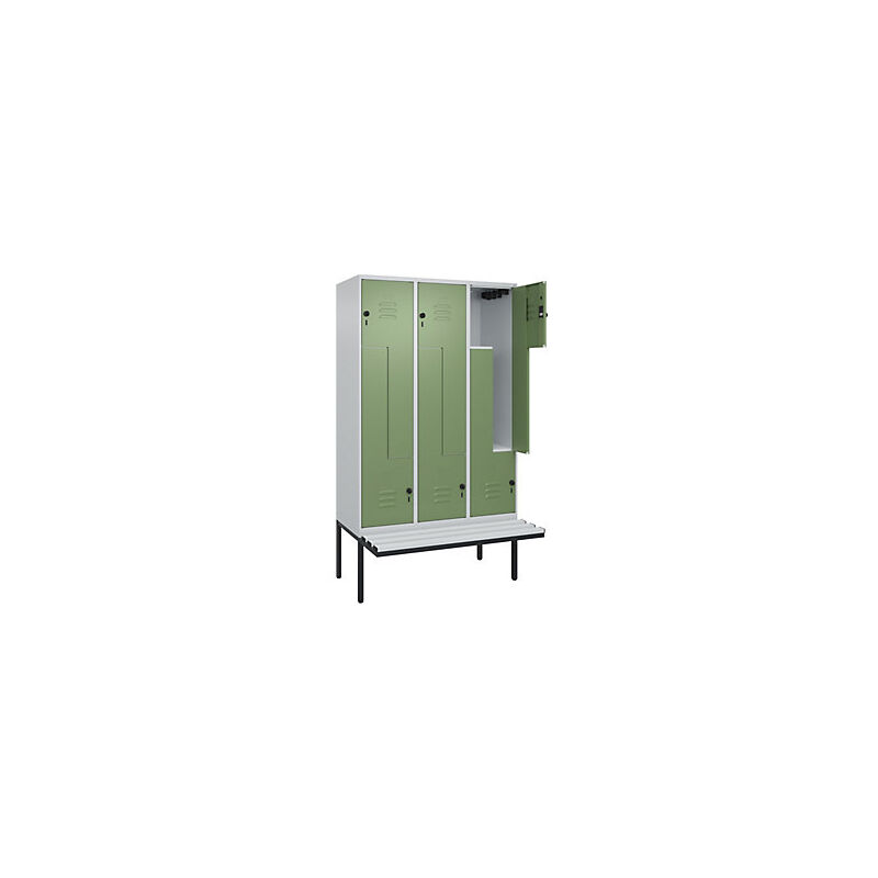 Armadietto a Z Classic PLUS con panca, 3 scomparti, grigio chiaro / verde reseda, largh. 1200 mm, serratura girevole di sicurezza, panca sporgente, plastica. Fornitura = montato. Altezza = 2120 mm. Larghezza = 1200 mm. Profondità = 815 mm. Colore corpo = grigio chiaro RAL 7035. Colore porta = verde reseda RAL 6011. Serratura = chiavistello girevole di sicurezza. Numero scomparti in larghezza = 3 pz. Numero scomparti = 6 pz. Materiale = acciaio. Larghezza scomparti = 200/400 mm. Dotazione interna = 1 asta appendiabiti con 4 ganci per scomparto. Altezza sedile = 450 mm. Profondità sedile = 310 mm. Altezza zoccolo = 420 mm. Altezza armadio = 1079 mm. Versione = con panca. Serie = CLASSIC PLUS. Altezza interna = 1637 mm. Possibilità di regolazione per la messa in piano su superfici irregolari. Frontali con fessure di areazione per una ventilazione ancora più efficace. Profili laterali delle ante chiusi per un'elevata resistenza alla torsione. Corpo con aperture di ventilazione nella parte