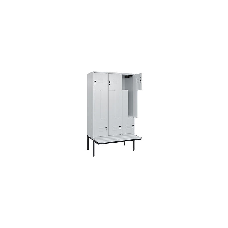 Armadietto a Z Classic PLUS con panca, 3 scomparti, grigio chiaro, largh. 1200 mm, serratura girevole di sicurezza, panca sporgente, plastica. Fornitura = montato. Altezza = 2120 mm. Larghezza = 1200 mm. Profondità = 815 mm. Colore corpo = grigio chiaro RAL 7035. Colore porta = grigio chiaro RAL 7035. Serratura = chiavistello girevole di sicurezza. Numero scomparti in larghezza = 3 pz. Numero scomparti = 6 pz. Materiale = acciaio. Larghezza scomparti = 200/400 mm. Dotazione interna = 1 asta appendiabiti con 4 ganci per scomparto. Altezza sedile = 450 mm. Profondità sedile = 310 mm. Altezza zoccolo = 420 mm. Altezza armadio = 1079 mm. Versione = con panca. Serie = CLASSIC PLUS. Altezza interna = 1637 mm. Possibilità di regolazione per la messa in piano su superfici irregolari. Frontali con fessure di areazione per una ventilazione ancora più efficace. Profili laterali delle ante chiusi per un'elevata resistenza alla torsione. Corpo con aperture di ventilazione nella parte superiore e