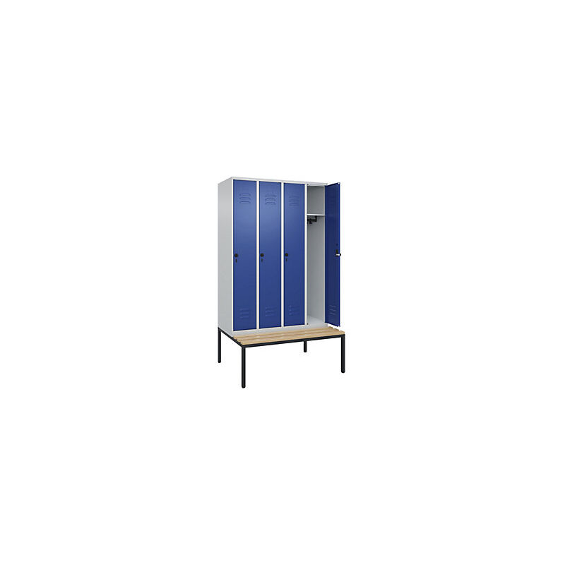 Armadietto Classic PLUS con panca, 4 scomparti, grigio chiaro / blu genziana, largh. 1200 mm, serratura girevole di sicurezza, panca integrata, legno duro di faggio. Fornitura = montato. Altezza = 2120 mm. Larghezza = 1200 mm. Profondità = 815 mm. Colore corpo = grigio chiaro RAL 7035. Colore porta = blu genziana RAL 5010. Serratura = chiavistello girevole di sicurezza. Numero scomparti in larghezza = 4 pz. Materiale = acciaio. Larghezza scomparti = 300 mm. Dotazione interna = 1 asta appendiabiti con 3 ganci e 1 ripiano per scomparto. Altezza sedile = 450 mm. Profondità sedile = 310 mm. Altezza zoccolo = 420 mm. Altezza armadio = 1175 mm. Versione = con panca integrata. Serie = CLASSIC PLUS. Altezza interna = 1637 mm. Ideali per l'industria e la produzione, società sportive e università. Possibilità di regolazione per la messa in piano su superfici irregolari. Frontali con fessure di areazione per una ventilazione ancora più efficace. Profili laterali delle ante chiusi per un'elevata