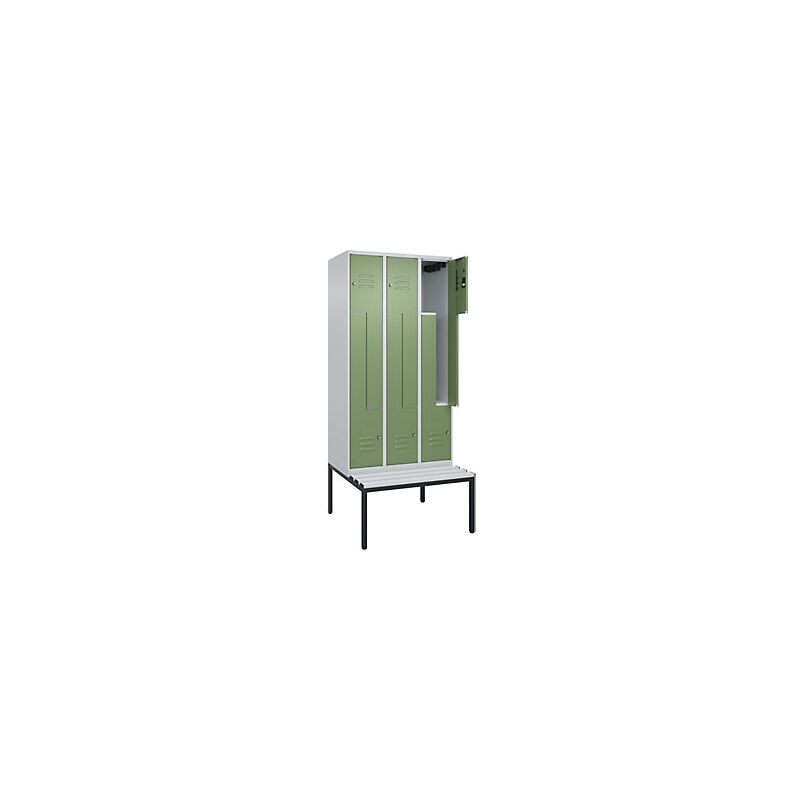 Armadietto a Z Classic PLUS con panca, 3 scomparti, grigio chiaro / verde reseda, largh. 900 mm, serratura a cilindro, panca integrata, plastica. Fornitura = montato. Altezza = 2120 mm. Larghezza = 900 mm. Profondità = 815 mm. Colore corpo = grigio chiaro RAL 7035. Colore porta = verde reseda RAL 6011. Serratura = serratura a cilindro. Numero scomparti in larghezza = 3 pz. Numero scomparti = 6 pz. Materiale = acciaio. Larghezza scomparti = 150/300 mm. Dotazione interna = 1 asta appendiabiti con 3 ganci per scomparto. Altezza sedile = 450 mm. Profondità sedile = 310 mm. Altezza zoccolo = 420 mm. Altezza armadio = 1079 mm. Versione = con panca integrata. Serie = CLASSIC PLUS. Altezza interna = 1637 mm. Possibilità di regolazione per la messa in piano su superfici irregolari. Frontali con fessure di areazione per una ventilazione ancora più efficace. Profili laterali delle ante chiusi per un'elevata resistenza alla torsione. Corpo con aperture di ventilazione nella parte superiore e