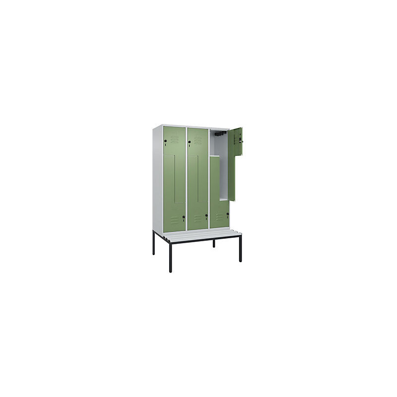 Armadietto a Z Classic PLUS con panca, 3 scomparti, grigio chiaro / verde reseda, largh. 1200 mm, serratura girevole di sicurezza, panca integrata, plastica. Fornitura = montato. Altezza = 2120 mm. Larghezza = 1200 mm. Profondità = 815 mm. Colore corpo = grigio chiaro RAL 7035. Colore porta = verde reseda RAL 6011. Serratura = chiavistello girevole di sicurezza. Numero scomparti in larghezza = 3 pz. Numero scomparti = 6 pz. Materiale = acciaio. Larghezza scomparti = 200/400 mm. Dotazione interna = 1 asta appendiabiti con 4 ganci per scomparto. Altezza sedile = 450 mm. Profondità sedile = 310 mm. Altezza zoccolo = 420 mm. Altezza armadio = 1079 mm. Versione = con panca integrata. Serie = CLASSIC PLUS. Altezza interna = 1637 mm. Possibilità di regolazione per la messa in piano su superfici irregolari. Frontali con fessure di areazione per una ventilazione ancora più efficace. Profili laterali delle ante chiusi per un'elevata resistenza alla torsione. Corpo con aperture di ventilazione