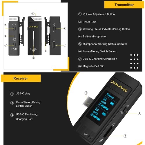 7RYMS Microfono Lavalier Wireless, RimoMic Pro USB C Mini Microfono Lavalier per Telefono Cellulare per iPhone/ipad, Microfono Wireless 2.4GHz Microfono da Bavero per YouTube/Facebook/TikTok
