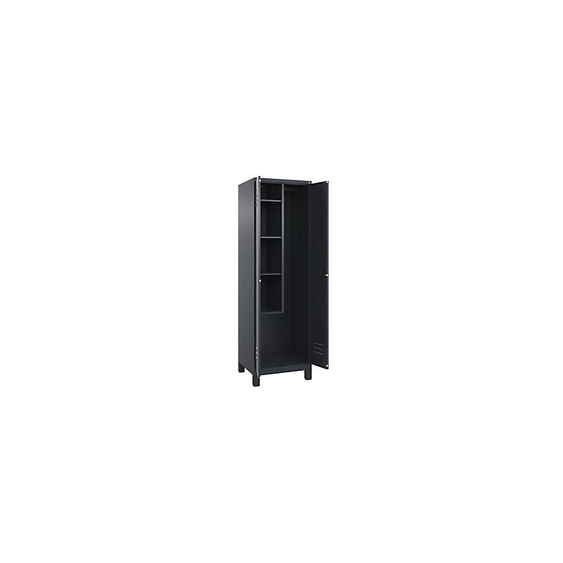 Armadietto per materiale di pulizia Classic PLUS, 1 scomparto, tramezza centrale, corta, grigio, largh. 600 mm, con piedini, serratura a cilindro. Fornitura = montato. Versione = parete divisoria centrale, accorciata. Altezza = 1950 mm. Profondità = 500 mm. Larghezza = 600 mm. Colore corpo = grigio antracite RAL 7016. Colore porta = grigio antracite RAL 7016. Serratura = serratura a cilindro. Numero scomparti in larghezza = 1 pz. Larghezza scomparti = 300 mm. Materiale = acciaio. Dotazione interna = 1 asta appendiabiti con 3 ganci, 4 ripiani. Altezza interna = 1787 mm. Profondità interna = 477 mm. Tipo di porta = anta a battente. Numero chiavi = 2 pz. Altezza zoccolo = 100 mm. Superficie = verniciatura. Ampio spazio sul fondo per riporre comodamente ad es. secchi per le pulizie. Frontali con fessure di areazione per una ventilazione ancora più efficace. Profili laterali delle ante chiusi per un'elevata resistenza alla torsione. Ante a battente con serratura unica. Corpo con aperture di