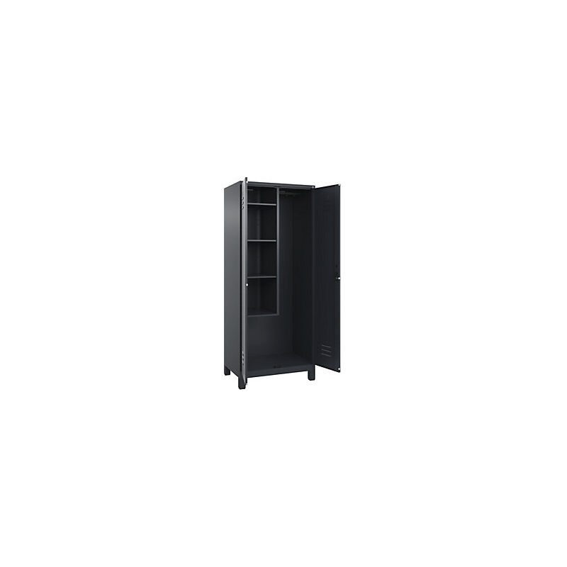 Armadietto per materiale di pulizia Classic PLUS, 1 scomparto, tramezza centrale, corta, grigio, largh. 800 mm, con piedini, serratura a cilindro. Fornitura = montato. Versione = parete divisoria centrale, accorciata. Altezza = 1950 mm. Profondità = 500 mm. Larghezza = 800 mm. Colore corpo = grigio antracite RAL 7016. Colore porta = grigio antracite RAL 7016. Serratura = serratura a cilindro. Numero scomparti in larghezza = 1 pz. Larghezza scomparti = 400 mm. Materiale = acciaio. Dotazione interna = 1 asta appendiabiti con 4 ganci, 4 ripiani. Altezza interna = 1787 mm. Profondità interna = 477 mm. Tipo di porta = anta a battente. Numero chiavi = 2 pz. Altezza zoccolo = 100 mm. Superficie = verniciatura. Ampio spazio sul fondo per riporre comodamente ad es. secchi per le pulizie. Frontali con fessure di areazione per una ventilazione ancora più efficace. Profili laterali delle ante chiusi per un'elevata resistenza alla torsione. Ante a battente con serratura unica. Corpo con aperture di