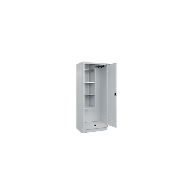 Armadietto per materiale di pulizia Classic PLUS, 1 scomparto, tramezza centrale, corta, grigio chiaro, largh. 800 mm, con zoccolino, serratura girevole. Fornitura = montato. Versione = parete divisoria centrale, accorciata. Altezza = 1950 mm. Profondità = 500 mm. Larghezza = 800 mm. Colore corpo = grigio chiaro RAL 7035. Colore porta = grigio chiaro RAL 7035. Serratura = chiavistello girevole. Numero scomparti in larghezza = 1 pz. Larghezza scomparti = 400 mm. Materiale = acciaio. Dotazione interna = 1 asta appendiabiti con 4 ganci, 4 ripiani. Altezza interna = 1787 mm. Profondità interna = 477 mm. Tipo di porta = anta a battente. Altezza zoccolo = 100 mm. Superficie = verniciatura. Ampio spazio sul fondo per riporre comodamente ad es. secchi per le pulizie. Frontali con fessure di areazione per una ventilazione ancora più efficace. Profili laterali delle ante chiusi per un'elevata resistenza alla torsione. Ante a battente con serratura unica. Corpo con aperture di ventilazione nella