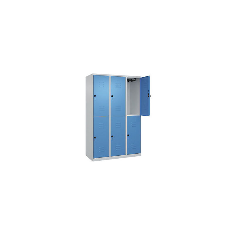 Armadietto a due piani Classic PLUS, 3 scomparti, grigio chiaro / blu chiaro, alt. x largh. 1850 x 1200 mm, con piedini a pavimento, serratura girevole. Fornitura = montato. Altezza = 1850 mm. Profondità = 500 mm. Larghezza = 1200 mm. Colore corpo = grigio chiaro RAL 7035. Colore porta = blu chiaro RAL 5012. Serratura = chiavistello girevole. Numero scomparti in larghezza = 3 pz. Numero scomparti = 6 pz. Larghezza scomparti = 400 mm. Materiale = acciaio. Dotazione interna = 1 asta appendiabiti con 4 ganci per scomparto. Altezza interna = 1787 mm. Profondità interna = 477 mm. Tipo di porta = anta a battente. Superficie = verniciatura. Frontali con fessure di areazione per una ventilazione ancora più efficace. Profili laterali delle ante chiusi per un'elevata resistenza alla torsione. Corpo con aperture di ventilazione nella parte superiore e inferiore per una circolazione ottimale dell'aria. Personalizzabili con piedini, zoccolino e piedini a pavimento. Risparmio di spazio del 50%