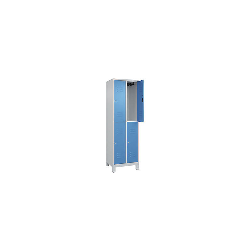 Armadietto a due piani Classic PLUS, 2 scomparti, grigio chiaro / blu chiaro, alt. x largh. 1950 x 600 mm, con piedini, serratura a cilindro. Fornitura = montato. Altezza = 1950 mm. Profondità = 500 mm. Larghezza = 600 mm. Colore corpo = grigio chiaro RAL 7035. Colore porta = blu chiaro RAL 5012. Serratura = serratura a cilindro. Numero scomparti in larghezza = 2 pz. Numero scomparti = 4 pz. Larghezza scomparti = 300 mm. Materiale = acciaio. Dotazione interna = 1 asta appendiabiti con 3 ganci per scomparto. Altezza interna = 1787 mm. Profondità interna = 477 mm. Tipo di porta = anta a battente. Numero chiavi = 2 pz. Altezza zoccolo = 100 mm. Superficie = verniciatura. Frontali con fessure di areazione per una ventilazione ancora più efficace. Profili laterali delle ante chiusi per un'elevata resistenza alla torsione. Corpo con aperture di ventilazione nella parte superiore e inferiore per una circolazione ottimale dell'aria. Personalizzabili con piedini, zoccolino e piedini a