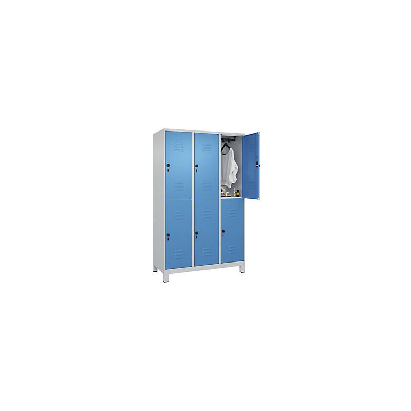 Armadietto a due piani Classic PLUS, 3 scomparti, grigio chiaro / blu chiaro, alt. x largh. 1950 x 1200 mm, con piedini, serratura girevole. Fornitura = montato. Altezza = 1950 mm. Profondità = 500 mm. Larghezza = 1200 mm. Colore corpo = grigio chiaro RAL 7035. Colore porta = blu chiaro RAL 5012. Serratura = chiavistello girevole. Numero scomparti in larghezza = 3 pz. Numero scomparti = 6 pz. Larghezza scomparti = 400 mm. Materiale = acciaio. Dotazione interna = 1 asta appendiabiti con 4 ganci per scomparto. Altezza interna = 1787 mm. Profondità interna = 477 mm. Tipo di porta = anta a battente. Altezza zoccolo = 100 mm. Superficie = verniciatura. Frontali con fessure di areazione per una ventilazione ancora più efficace. Profili laterali delle ante chiusi per un'elevata resistenza alla torsione. Corpo con aperture di ventilazione nella parte superiore e inferiore per una circolazione ottimale dell'aria. Personalizzabili con piedini, zoccolino e piedini a pavimento. Risparmio di spazio