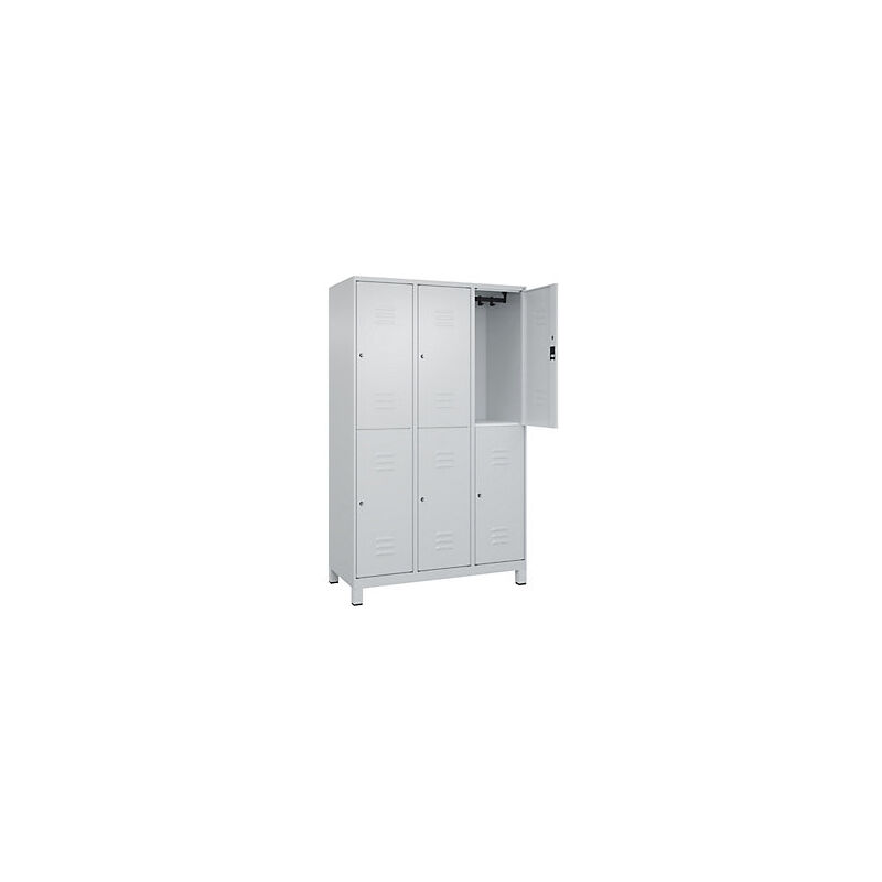 Armadietto a due piani Classic PLUS, 3 scomparti, grigio chiaro, alt. x largh. 1950 x 1200 mm, con piedini, serratura a cilindro. Fornitura = montato. Altezza = 1950 mm. Profondità = 500 mm. Larghezza = 1200 mm. Colore corpo = grigio chiaro RAL 7035. Colore porta = grigio chiaro RAL 7035. Serratura = serratura a cilindro. Numero scomparti in larghezza = 3 pz. Numero scomparti = 6 pz. Larghezza scomparti = 400 mm. Materiale = acciaio. Dotazione interna = 1 asta appendiabiti con 4 ganci per scomparto. Altezza interna = 1787 mm. Profondità interna = 477 mm. Tipo di porta = anta a battente. Numero chiavi = 2 pz. Altezza zoccolo = 100 mm. Superficie = verniciatura. Frontali con fessure di areazione per una ventilazione ancora più efficace. Profili laterali delle ante chiusi per un'elevata resistenza alla torsione. Corpo con aperture di ventilazione nella parte superiore e inferiore per una circolazione ottimale dell'aria. Personalizzabili con piedini, zoccolino e piedini a pavimento.