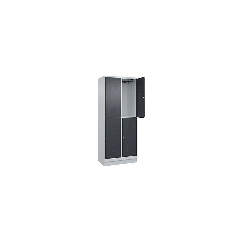 Armadietto a due piani Classic PLUS, 2 scomparti, grigio chiaro / grigio, alt. x largh. 1950 x 800 mm, con zoccolino, serratura a cilindro. Fornitura = montato. Altezza = 1950 mm. Profondità = 500 mm. Larghezza = 800 mm. Colore corpo = grigio chiaro RAL 7035. Colore porta = grigio antracite RAL 7016. Serratura = serratura a cilindro. Numero scomparti in larghezza = 2 pz. Numero scomparti = 4 pz. Larghezza scomparti = 400 mm. Materiale = acciaio. Dotazione interna = 1 asta appendiabiti con 4 ganci per scomparto. Altezza interna = 1787 mm. Profondità interna = 477 mm. Tipo di porta = anta a battente. Numero chiavi = 2 pz. Altezza zoccolo = 100 mm. Superficie = verniciatura. Frontali con fessure di areazione per una ventilazione ancora più efficace. Profili laterali delle ante chiusi per un'elevata resistenza alla torsione. Corpo con aperture di ventilazione nella parte superiore e inferiore per una circolazione ottimale dell'aria. Personalizzabili con piedini, zoccolino e piedini a