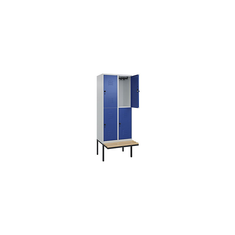 Armadietto a due piani Classic PLUS con panca, 2 scomparti, grigio chiaro / blu genziana, largh. 800 mm, serratura girevole di sicurezza, panca sporgente, legno duro di faggio. Fornitura = montato. Altezza = 2120 mm. Larghezza = 800 mm. Profondità = 815 mm. Colore corpo = grigio chiaro RAL 7035. Colore porta = blu genziana RAL 5010. Serratura = chiavistello girevole di sicurezza. Numero scomparti in larghezza = 2 pz. Numero scomparti = 4 pz. Materiale = acciaio. Larghezza scomparti = 400 mm. Dotazione interna = 1 asta appendiabiti con 4 ganci per scomparto. Altezza sedile = 450 mm. Profondità sedile = 310 mm. Altezza zoccolo = 420 mm. Altezza armadio = 720 mm. Versione = con panca. Serie = CLASSIC PLUS. Altezza interna = 1637 mm. Possibilità di regolazione per la messa in piano su superfici irregolari. Frontali con fessure di areazione per una ventilazione ancora più efficace. Profili laterali delle ante chiusi per un'elevata resistenza alla torsione. Corpo con aperture di ventilazione