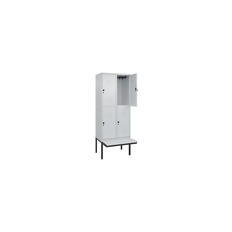 Armadietto a due piani Classic PLUS con panca, 2 scomparti, grigio chiaro, largh. 800 mm, serratura girevole di sicurezza, panca sporgente, plastica. Fornitura = montato. Altezza = 2120 mm. Larghezza = 800 mm. Profondità = 815 mm. Colore corpo = grigio chiaro RAL 7035. Colore porta = grigio chiaro RAL 7035. Serratura = chiavistello girevole di sicurezza. Numero scomparti in larghezza = 2 pz. Numero scomparti = 4 pz. Materiale = acciaio. Larghezza scomparti = 400 mm. Dotazione interna = 1 asta appendiabiti con 4 ganci per scomparto. Altezza sedile = 450 mm. Profondità sedile = 310 mm. Altezza zoccolo = 420 mm. Altezza armadio = 720 mm. Versione = con panca. Serie = CLASSIC PLUS. Altezza interna = 1637 mm. Possibilità di regolazione per la messa in piano su superfici irregolari. Frontali con fessure di areazione per una ventilazione ancora più efficace. Profili laterali delle ante chiusi per un'elevata resistenza alla torsione. Corpo con aperture di ventilazione nella parte superiore e
