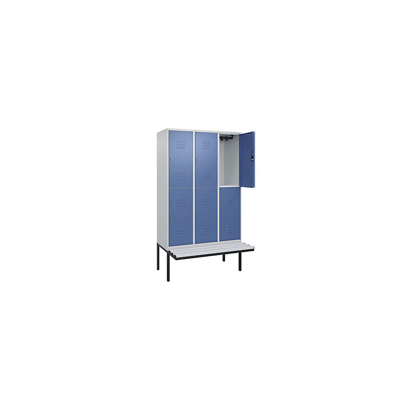 Armadietto a due piani Classic PLUS con panca, 3 scomparti, grigio chiaro / indaco, largh. 1200 mm, serratura a cilindro, panca sporgente, plastica. Fornitura = montato. Altezza = 2120 mm. Larghezza = 1200 mm. Profondità = 815 mm. Colore corpo = grigio chiaro RAL 7035. Colore porta = indaco RAL 5023. Serratura = serratura a cilindro. Numero scomparti in larghezza = 3 pz. Numero scomparti = 6 pz. Materiale = acciaio. Larghezza scomparti = 400 mm. Dotazione interna = 1 asta appendiabiti con 4 ganci per scomparto. Altezza sedile = 450 mm. Profondità sedile = 310 mm. Altezza zoccolo = 420 mm. Altezza armadio = 720 mm. Versione = con panca. Serie = CLASSIC PLUS. Altezza interna = 1637 mm. Possibilità di regolazione per la messa in piano su superfici irregolari. Frontali con fessure di areazione per una ventilazione ancora più efficace. Profili laterali delle ante chiusi per un'elevata resistenza alla torsione. Corpo con aperture di ventilazione nella parte superiore e inferiore per una