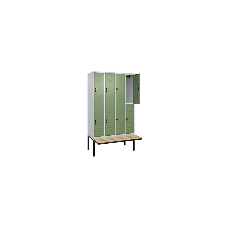 Armadietto a due piani Classic PLUS con panca, 4 scomparti, grigio chiaro / verde reseda, largh. 1200 mm, serratura girevole di sicurezza, panca sporgente, legno duro di faggio. Fornitura = montato. Altezza = 2120 mm. Larghezza = 1200 mm. Profondità = 815 mm. Colore corpo = grigio chiaro RAL 7035. Colore porta = verde reseda RAL 6011. Serratura = chiavistello girevole di sicurezza. Numero scomparti in larghezza = 4 pz. Numero scomparti = 8 pz. Materiale = acciaio. Larghezza scomparti = 300 mm. Dotazione interna = 1 asta appendiabiti con 3 ganci per scomparto. Altezza sedile = 450 mm. Profondità sedile = 310 mm. Altezza zoccolo = 420 mm. Altezza armadio = 720 mm. Versione = con panca. Serie = CLASSIC PLUS. Altezza interna = 1637 mm. Possibilità di regolazione per la messa in piano su superfici irregolari. Frontali con fessure di areazione per una ventilazione ancora più efficace. Profili laterali delle ante chiusi per un'elevata resistenza alla torsione. Corpo con aperture di