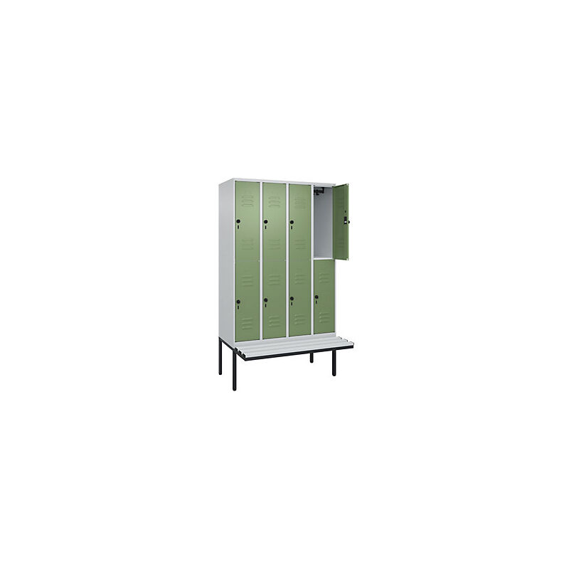 Armadietto a due piani Classic PLUS con panca, 4 scomparti, grigio chiaro / verde reseda, largh. 1200 mm, serratura girevole di sicurezza, panca sporgente, plastica. Fornitura = montato. Altezza = 2120 mm. Larghezza = 1200 mm. Profondità = 815 mm. Colore corpo = grigio chiaro RAL 7035. Colore porta = verde reseda RAL 6011. Serratura = chiavistello girevole di sicurezza. Numero scomparti in larghezza = 4 pz. Numero scomparti = 8 pz. Materiale = acciaio. Larghezza scomparti = 300 mm. Dotazione interna = 1 asta appendiabiti con 3 ganci per scomparto. Altezza sedile = 450 mm. Profondità sedile = 310 mm. Altezza zoccolo = 420 mm. Altezza armadio = 720 mm. Versione = con panca. Serie = CLASSIC PLUS. Altezza interna = 1637 mm. Possibilità di regolazione per la messa in piano su superfici irregolari. Frontali con fessure di areazione per una ventilazione ancora più efficace. Profili laterali delle ante chiusi per un'elevata resistenza alla torsione. Corpo con aperture di ventilazione nella