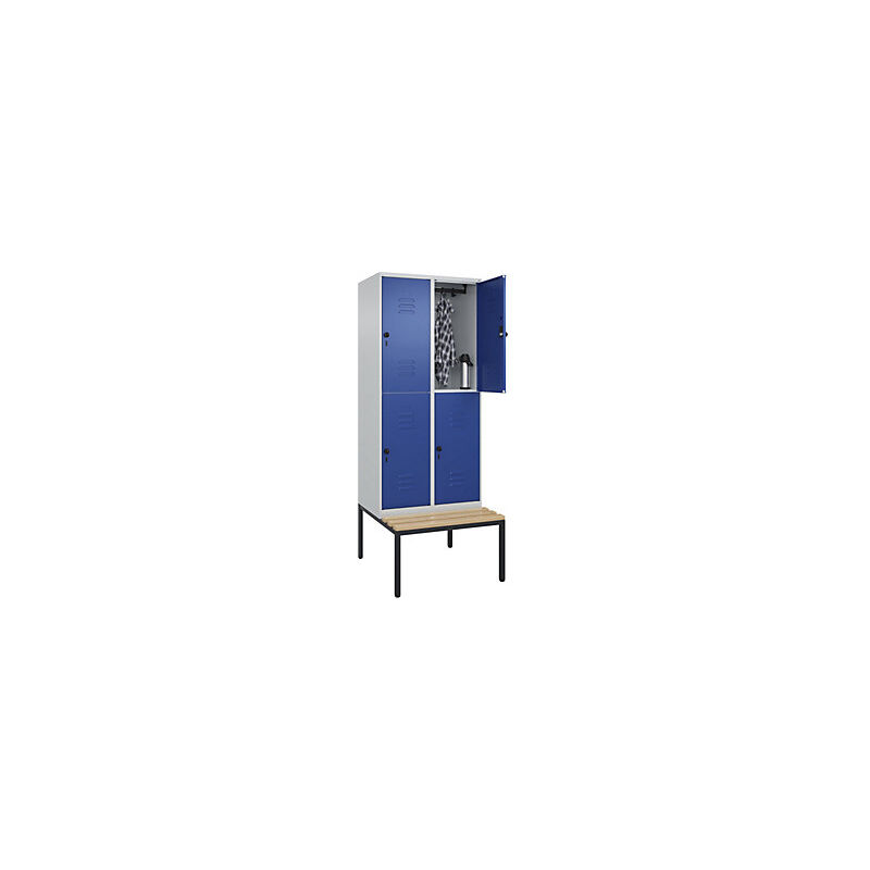 Armadietto a due piani Classic PLUS con panca, 2 scomparti, grigio chiaro / blu genziana, largh. 800 mm, serratura girevole di sicurezza, panca integrata, legno duro di faggio. Fornitura = montato. Altezza = 2120 mm. Larghezza = 800 mm. Profondità = 815 mm. Colore corpo = grigio chiaro RAL 7035. Colore porta = blu genziana RAL 5010. Serratura = chiavistello girevole di sicurezza. Numero scomparti in larghezza = 2 pz. Numero scomparti = 4 pz. Materiale = acciaio. Larghezza scomparti = 400 mm. Dotazione interna = 1 asta appendiabiti con 4 ganci per scomparto. Altezza sedile = 450 mm. Profondità sedile = 310 mm. Altezza zoccolo = 420 mm. Altezza armadio = 720 mm. Versione = con panca integrata. Serie = CLASSIC PLUS. Altezza interna = 1637 mm. Possibilità di regolazione per la messa in piano su superfici irregolari. Frontali con fessure di areazione per una ventilazione ancora più efficace. Profili laterali delle ante chiusi per un'elevata resistenza alla torsione. Corpo con aperture di