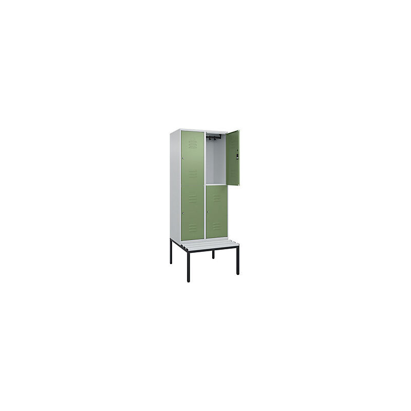 Armadietto a due piani Classic PLUS con panca, 2 scomparti, grigio chiaro / verde reseda, largh. 800 mm, serratura a cilindro, panca integrata, plastica. Fornitura = montato. Altezza = 2120 mm. Larghezza = 800 mm. Profondità = 815 mm. Colore corpo = grigio chiaro RAL 7035. Colore porta = verde reseda RAL 6011. Serratura = serratura a cilindro. Numero scomparti in larghezza = 2 pz. Numero scomparti = 4 pz. Materiale = acciaio. Larghezza scomparti = 400 mm. Dotazione interna = 1 asta appendiabiti con 4 ganci per scomparto. Altezza sedile = 450 mm. Profondità sedile = 310 mm. Altezza zoccolo = 420 mm. Altezza armadio = 720 mm. Versione = con panca integrata. Serie = CLASSIC PLUS. Altezza interna = 1637 mm. Possibilità di regolazione per la messa in piano su superfici irregolari. Frontali con fessure di areazione per una ventilazione ancora più efficace. Profili laterali delle ante chiusi per un'elevata resistenza alla torsione. Corpo con aperture di ventilazione nella parte superiore e