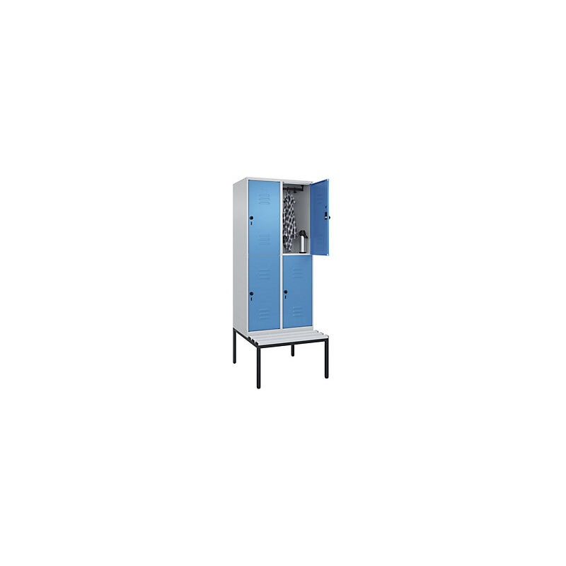 Armadietto a due piani Classic PLUS con panca, 2 scomparti, grigio chiaro / blu chiaro, largh. 800 mm, serratura girevole di sicurezza, panca integrata, plastica. Fornitura = montato. Altezza = 2120 mm. Larghezza = 800 mm. Profondità = 815 mm. Colore corpo = grigio chiaro RAL 7035. Colore porta = blu chiaro RAL 5012. Serratura = chiavistello girevole di sicurezza. Numero scomparti in larghezza = 2 pz. Numero scomparti = 4 pz. Materiale = acciaio. Larghezza scomparti = 400 mm. Dotazione interna = 1 asta appendiabiti con 4 ganci per scomparto. Altezza sedile = 450 mm. Profondità sedile = 310 mm. Altezza zoccolo = 420 mm. Altezza armadio = 720 mm. Versione = con panca integrata. Serie = CLASSIC PLUS. Altezza interna = 1637 mm. Possibilità di regolazione per la messa in piano su superfici irregolari. Frontali con fessure di areazione per una ventilazione ancora più efficace. Profili laterali delle ante chiusi per un'elevata resistenza alla torsione. Corpo con aperture di ventilazione nella