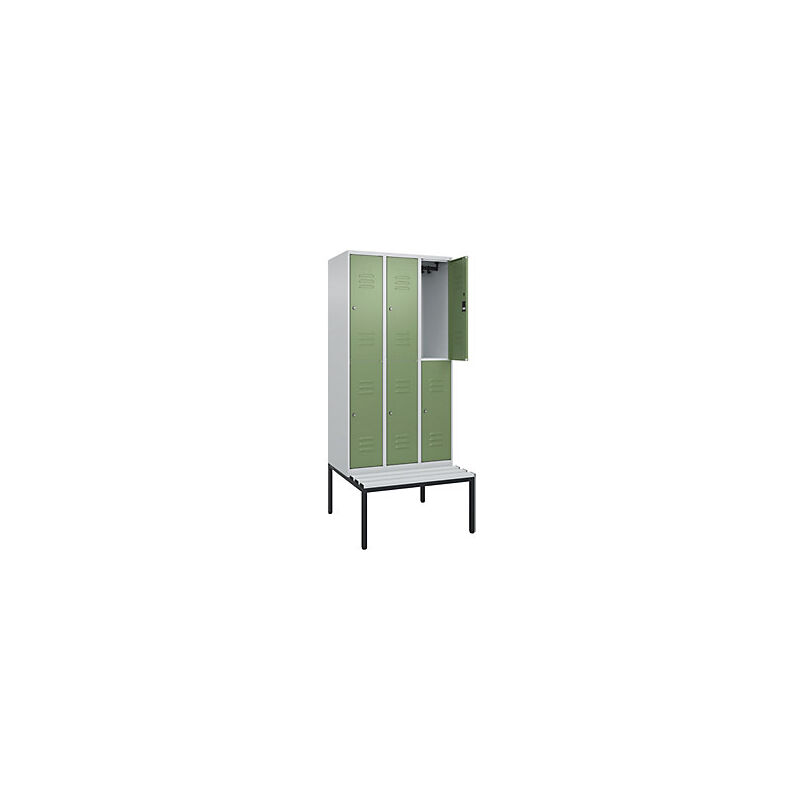 Armadietto a due piani Classic PLUS con panca, 3 scomparti, grigio chiaro / verde reseda, largh. 900 mm, serratura a cilindro, panca integrata, plastica. Fornitura = montato. Altezza = 2120 mm. Larghezza = 900 mm. Profondità = 815 mm. Colore corpo = grigio chiaro RAL 7035. Colore porta = verde reseda RAL 6011. Serratura = serratura a cilindro. Numero scomparti in larghezza = 3 pz. Numero scomparti = 6 pz. Materiale = acciaio. Larghezza scomparti = 300 mm. Dotazione interna = 1 asta appendiabiti con 3 ganci per scomparto. Altezza sedile = 450 mm. Profondità sedile = 310 mm. Altezza zoccolo = 420 mm. Altezza armadio = 720 mm. Versione = con panca integrata. Serie = CLASSIC PLUS. Altezza interna = 1637 mm. Possibilità di regolazione per la messa in piano su superfici irregolari. Frontali con fessure di areazione per una ventilazione ancora più efficace. Profili laterali delle ante chiusi per un'elevata resistenza alla torsione. Corpo con aperture di ventilazione nella parte superiore e