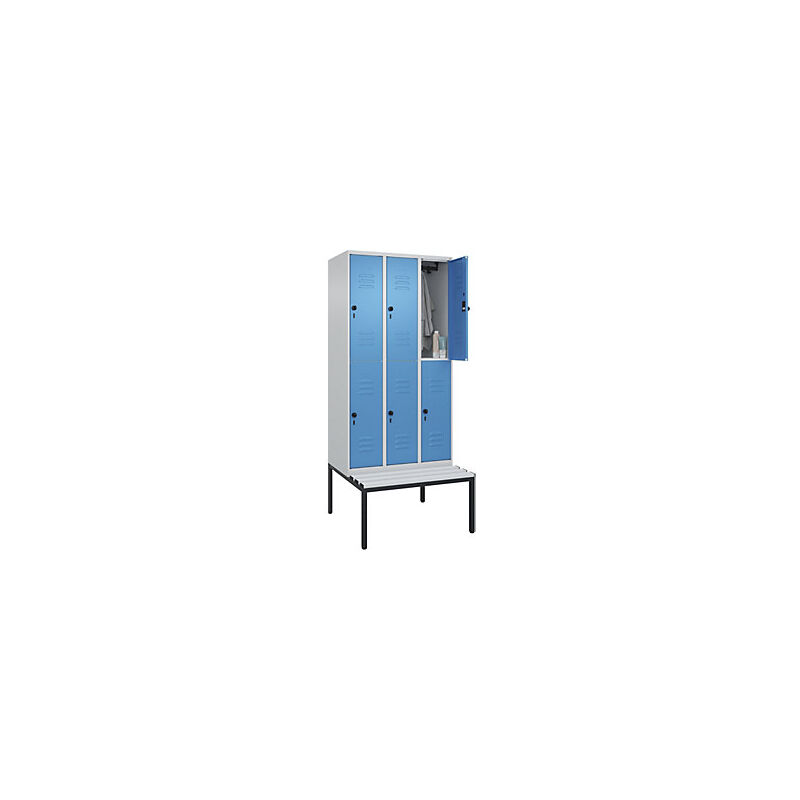 Armadietto a due piani Classic PLUS con panca, 3 scomparti, grigio chiaro / blu chiaro, largh. 900 mm, serratura girevole di sicurezza, panca integrata, plastica. Fornitura = montato. Altezza = 2120 mm. Larghezza = 900 mm. Profondità = 815 mm. Colore corpo = grigio chiaro RAL 7035. Colore porta = blu chiaro RAL 5012. Serratura = chiavistello girevole di sicurezza. Numero scomparti in larghezza = 3 pz. Numero scomparti = 6 pz. Materiale = acciaio. Larghezza scomparti = 300 mm. Dotazione interna = 1 asta appendiabiti con 3 ganci per scomparto. Altezza sedile = 450 mm. Profondità sedile = 310 mm. Altezza zoccolo = 420 mm. Altezza armadio = 720 mm. Versione = con panca integrata. Serie = CLASSIC PLUS. Altezza interna = 1637 mm. Possibilità di regolazione per la messa in piano su superfici irregolari. Frontali con fessure di areazione per una ventilazione ancora più efficace. Profili laterali delle ante chiusi per un'elevata resistenza alla torsione. Corpo con aperture di ventilazione nella