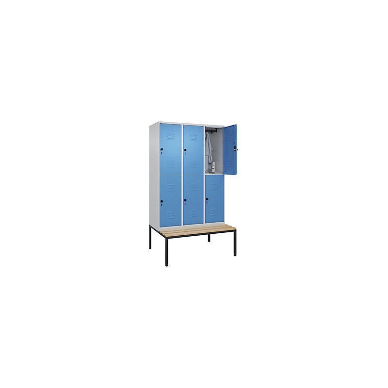 Armadietto a due piani Classic PLUS con panca, 3 scomparti, grigio chiaro / blu chiaro, largh. 1200 mm, serratura girevole di sicurezza, panca integrata, legno duro di faggio. Fornitura = montato. Altezza = 2120 mm. Larghezza = 1200 mm. Profondità = 815 mm. Colore corpo = grigio chiaro RAL 7035. Colore porta = blu chiaro RAL 5012. Serratura = chiavistello girevole di sicurezza. Numero scomparti in larghezza = 3 pz. Numero scomparti = 6 pz. Materiale = acciaio. Larghezza scomparti = 400 mm. Dotazione interna = 1 asta appendiabiti con 4 ganci per scomparto. Altezza sedile = 450 mm. Profondità sedile = 310 mm. Altezza zoccolo = 420 mm. Altezza armadio = 720 mm. Versione = con panca integrata. Serie = CLASSIC PLUS. Altezza interna = 1637 mm. Possibilità di regolazione per la messa in piano su superfici irregolari. Frontali con fessure di areazione per una ventilazione ancora più efficace. Profili laterali delle ante chiusi per un'elevata resistenza alla torsione. Corpo con aperture di