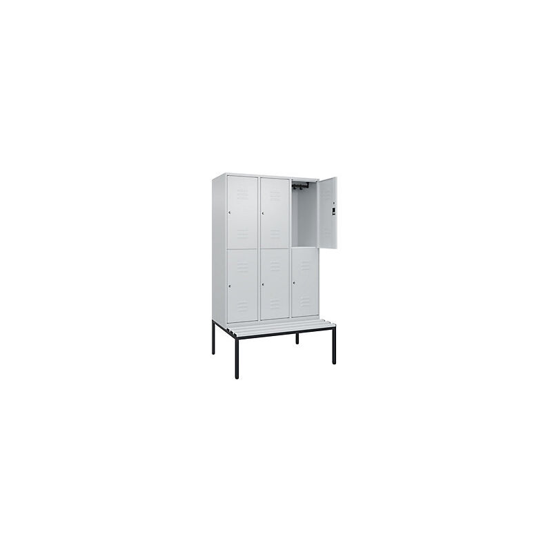 Armadietto a due piani Classic PLUS con panca, 3 scomparti, grigio chiaro, largh. 1200 mm, serratura a cilindro, panca integrata, plastica. Fornitura = montato. Altezza = 2120 mm. Larghezza = 1200 mm. Profondità = 815 mm. Colore corpo = grigio chiaro RAL 7035. Colore porta = grigio chiaro RAL 7035. Serratura = serratura a cilindro. Numero scomparti in larghezza = 3 pz. Numero scomparti = 6 pz. Materiale = acciaio. Larghezza scomparti = 400 mm. Dotazione interna = 1 asta appendiabiti con 4 ganci per scomparto. Altezza sedile = 450 mm. Profondità sedile = 310 mm. Altezza zoccolo = 420 mm. Altezza armadio = 720 mm. Versione = con panca integrata. Serie = CLASSIC PLUS. Altezza interna = 1637 mm. Possibilità di regolazione per la messa in piano su superfici irregolari. Frontali con fessure di areazione per una ventilazione ancora più efficace. Profili laterali delle ante chiusi per un'elevata resistenza alla torsione. Corpo con aperture di ventilazione nella parte superiore e inferiore per
