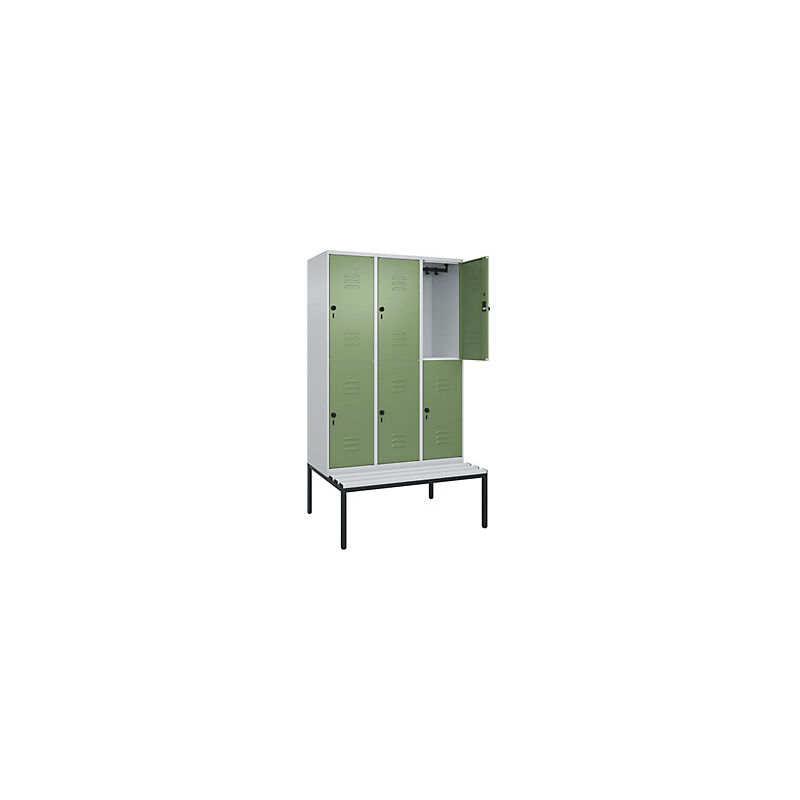 Armadietto a due piani Classic PLUS con panca, 3 scomparti, grigio chiaro / verde reseda, largh. 1200 mm, serratura girevole di sicurezza, panca integrata, plastica. Fornitura = montato. Altezza = 2120 mm. Larghezza = 1200 mm. Profondità = 815 mm. Colore corpo = grigio chiaro RAL 7035. Colore porta = verde reseda RAL 6011. Serratura = chiavistello girevole di sicurezza. Numero scomparti in larghezza = 3 pz. Numero scomparti = 6 pz. Materiale = acciaio. Larghezza scomparti = 400 mm. Dotazione interna = 1 asta appendiabiti con 4 ganci per scomparto. Altezza sedile = 450 mm. Profondità sedile = 310 mm. Altezza zoccolo = 420 mm. Altezza armadio = 720 mm. Versione = con panca integrata. Serie = CLASSIC PLUS. Altezza interna = 1637 mm. Possibilità di regolazione per la messa in piano su superfici irregolari. Frontali con fessure di areazione per una ventilazione ancora più efficace. Profili laterali delle ante chiusi per un'elevata resistenza alla torsione. Corpo con aperture di ventilazione