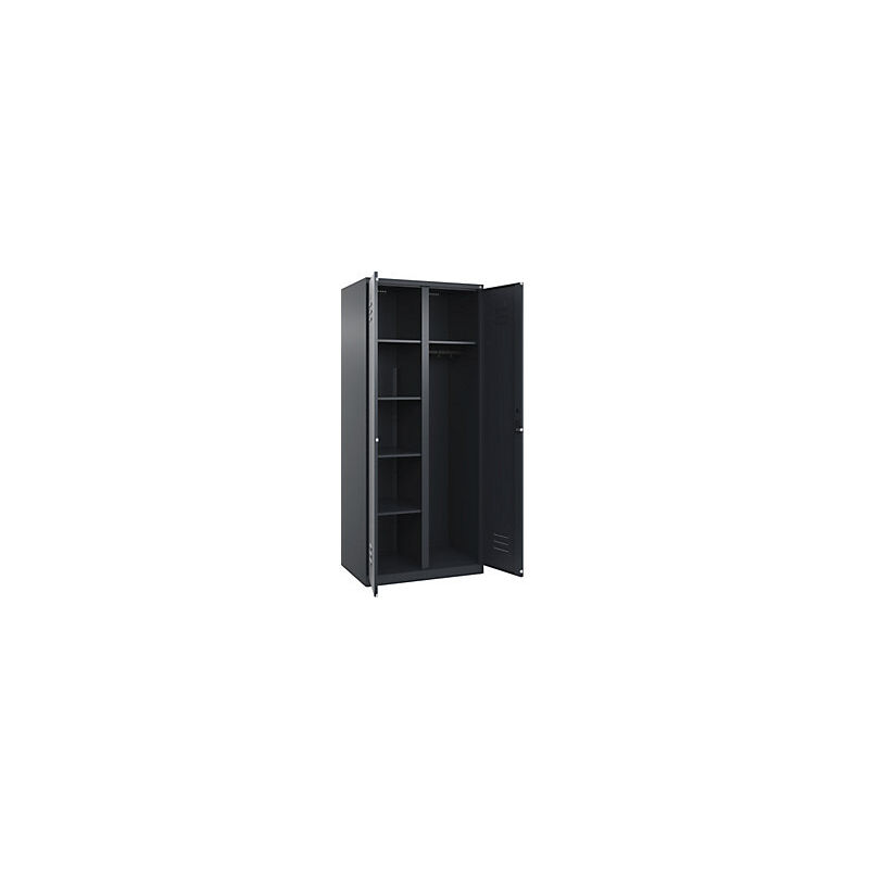 Armadietto per materiale di pulizia Classic PLUS, 1 scomparto, tramezza centrale, grigio, largh. 800 mm, con piedini a pavimento, serratura a cilindro. Fornitura = montato. Versione = parete divisoria centrale. Altezza = 1850 mm. Profondità = 500 mm. Larghezza = 800 mm. Colore corpo = grigio antracite RAL 7016. Colore porta = grigio antracite RAL 7016. Serratura = serratura a cilindro. Numero scomparti in larghezza = 1 pz. Larghezza scomparti = 400 mm. Materiale = acciaio. Dotazione interna = 1 asta appendiabiti con 4 ganci, 5 ripiani. Altezza interna = 1787 mm. Profondità interna = 477 mm. Tipo di porta = anta a battente. Numero chiavi = 2 pz. Superficie = verniciatura. Frontali con fessure di areazione per una ventilazione ancora più efficace. Profili laterali delle ante chiusi per un'elevata resistenza alla torsione. Ante a battente con serratura unica. Corpo con aperture di ventilazione nella parte superiore e inferiore per una circolazione ottimale dell'aria. Personalizzabili con