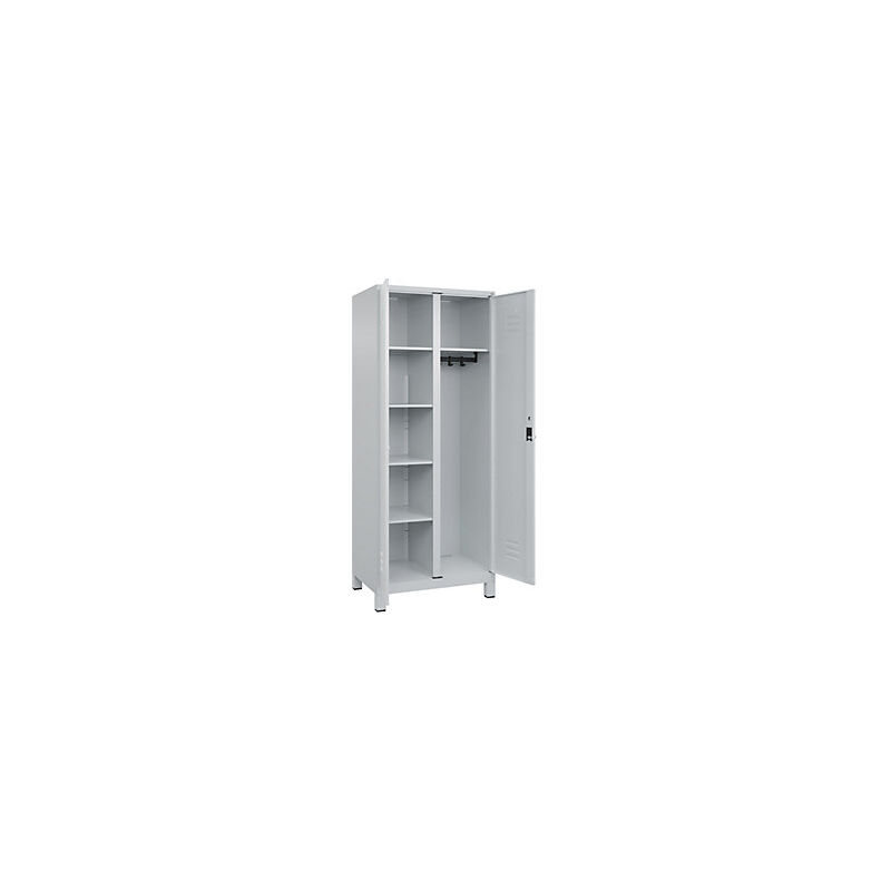 Armadietto per materiale di pulizia Classic PLUS, 1 scomparto, tramezza centrale, grigio chiaro, largh. 800 mm, con piedini, serratura girevole. Fornitura = montato. Versione = parete divisoria centrale. Altezza = 1950 mm. Profondità = 500 mm. Larghezza = 800 mm. Colore corpo = grigio chiaro RAL 7035. Colore porta = grigio chiaro RAL 7035. Serratura = chiavistello girevole. Numero scomparti in larghezza = 1 pz. Larghezza scomparti = 400 mm. Materiale = acciaio. Dotazione interna = 1 asta appendiabiti con 4 ganci, 5 ripiani. Altezza interna = 1787 mm. Profondità interna = 477 mm. Tipo di porta = anta a battente. Altezza zoccolo = 100 mm. Superficie = verniciatura. Frontali con fessure di areazione per una ventilazione ancora più efficace. Profili laterali delle ante chiusi per un'elevata resistenza alla torsione. Ante a battente con serratura unica. Corpo con aperture di ventilazione nella parte superiore e inferiore per una circolazione ottimale dell'aria. Personalizzabili con piedini