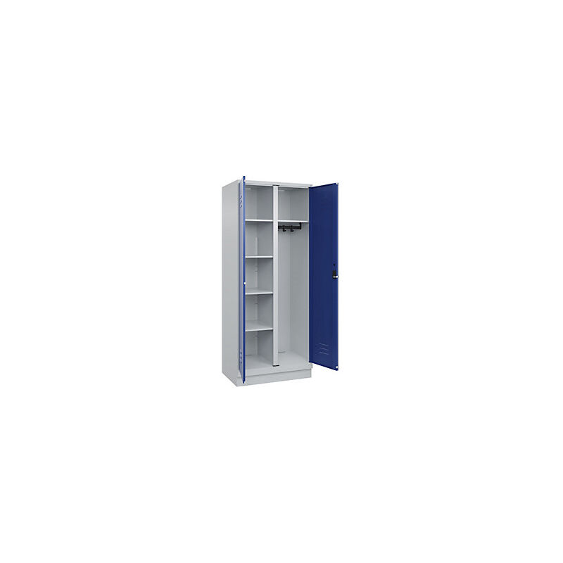 Armadietto per materiale di pulizia Classic PLUS, 1 scomparto, tramezza centrale, grigio chiaro / blu genziana, largh. 800 mm, con zoccolino, serratura girevole. Fornitura = montato. Versione = parete divisoria centrale. Altezza = 1950 mm. Profondità = 500 mm. Larghezza = 800 mm. Colore corpo = grigio chiaro RAL 7035. Colore porta = blu genziana RAL 5010. Serratura = chiavistello girevole. Numero scomparti in larghezza = 1 pz. Larghezza scomparti = 400 mm. Materiale = acciaio. Dotazione interna = 1 asta appendiabiti con 4 ganci, 5 ripiani. Altezza interna = 1787 mm. Profondità interna = 477 mm. Tipo di porta = anta a battente. Altezza zoccolo = 100 mm. Superficie = verniciatura. Frontali con fessure di areazione per una ventilazione ancora più efficace. Profili laterali delle ante chiusi per un'elevata resistenza alla torsione. Ante a battente con serratura unica. Corpo con aperture di ventilazione nella parte superiore e inferiore per una circolazione ottimale dell'aria.