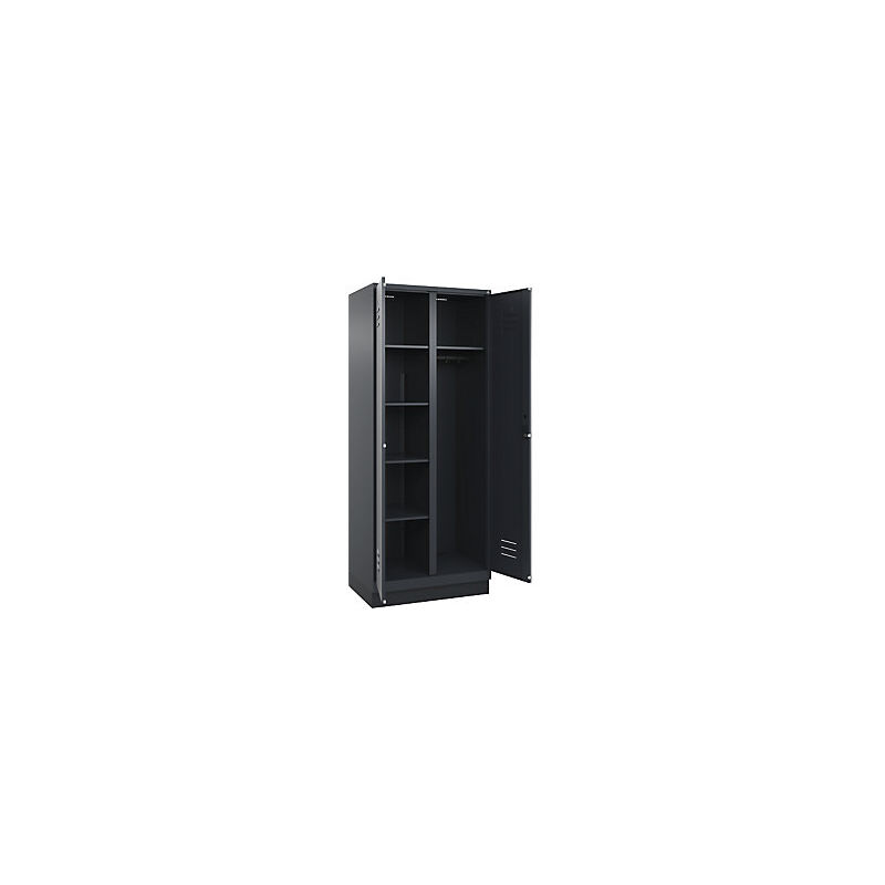 Armadietto per materiale di pulizia Classic PLUS, 1 scomparto, tramezza centrale, grigio, largh. 800 mm, con zoccolino, serratura a cilindro. Fornitura = montato. Versione = parete divisoria centrale. Altezza = 1950 mm. Profondità = 500 mm. Larghezza = 800 mm. Colore corpo = grigio antracite RAL 7016. Colore porta = grigio antracite RAL 7016. Serratura = serratura a cilindro. Numero scomparti in larghezza = 1 pz. Larghezza scomparti = 400 mm. Materiale = acciaio. Dotazione interna = 1 asta appendiabiti con 4 ganci, 5 ripiani. Altezza interna = 1787 mm. Profondità interna = 477 mm. Tipo di porta = anta a battente. Numero chiavi = 2 pz. Altezza zoccolo = 100 mm. Superficie = verniciatura. Frontali con fessure di areazione per una ventilazione ancora più efficace. Profili laterali delle ante chiusi per un'elevata resistenza alla torsione. Ante a battente con serratura unica. Corpo con aperture di ventilazione nella parte superiore e inferiore per una circolazione ottimale dell'aria.