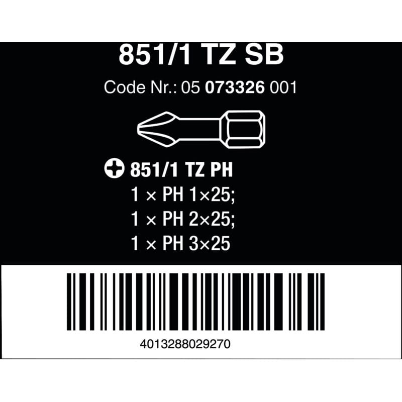 Dettagli tecnici Contenuto 3 pz. Dimensione (Cacciavite) PH 1, PH 2, PH 3 Dimensione del prodotto, lunghezza 25 mm Forma (inserti) D 6.3 Forza Croce Phillips Impronta (cacciavite) 1/4 (6.3 mm) Materiale Acciaio per utensili Peso 18.8 g Proprietà del materiale duro Tipo prodotto Inserto a Croce 851/1 TZ SB Inserti a croce, PH 1 - 3 x 25 mm I bit tenaci con torsione, particolarmente adatto per l'avvitamento in lamiera o metallo. La proprietà della tenaci la rottura precoce della punta di presa. La torsione, picchi di coppia e aumenta la durata del bit. Testo tradotto automaticamente. Punti di forza e dettagli Per viti a croce Phillips-Recess Tenace duro, adatto in particolar modo per materiali duri come p.es. latta o metallo Forma a torsione per prevenire l'usura precoce Attacco esagonale da 1/4 Adatto per Bosch, Fein, Holz-Her, Lecreux, Metabo Caratteristiche Wera TZ-Bit: Z-Bit (particolarmente adatto per materiali duri come p. es. metallo) con torsione. Bit di torsione garantiscono