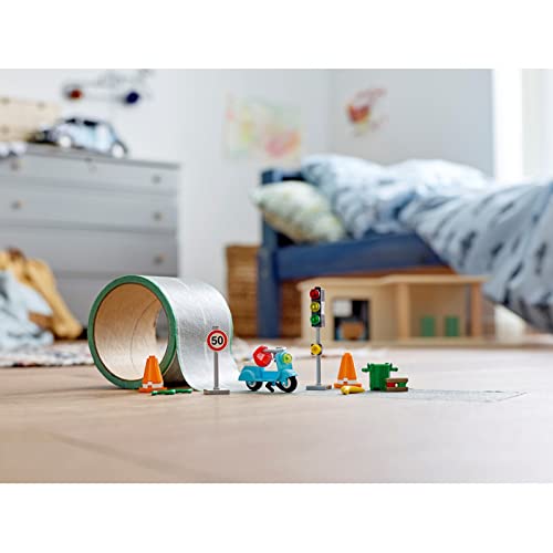 Gli accessori includono tra l'altro un cartello di velocità, un cono di guida, un semaforo e uno scooter. Il set può essere combinato con altri set Lego, in modo che i bambini possano far scorrere tutti i loro veicoli LEGO tramite il nastro adesivo.