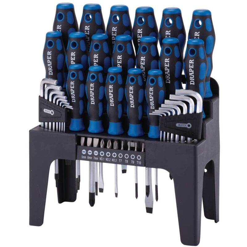 Utile set di cacciaviti, fornito con una selezione di strumenti ideali per l'uso quotidiano. Il set include 17 cacciaviti, cacciavite, 10 inserti e 16 chiavi esagonali. Tutti gli articoli sono realizzati in acciaio al cromo vanadio temprato, che è stato correttamente temperato per una maggiore resistenza e durata. Ogni cacciavite ha una punta sabbiata, che produce una presa extra sulla testa delle viti. I manici del cacciavite con impugnatura morbida sono progettati ergonomicamente per offrire una maggiore presa e coppia mentre producono comfort per l'utente anche se utilizzati per periodi prolungati. Questo kit da 44 pezzi è ideale per l'uso in casa e in officina. Tutti gli strumenti Draper sono realizzati secondo elevati standard di qualità che sono rigorosamente controllati dagli ingegneri di controllo qualità Draper. Ogni prodotto offre un buon rapporto qualità-prezzo ed è ricco di funzioni utili per migliorare le sue prestazioni. Tutti i prodotti Draper sono coperti dalla