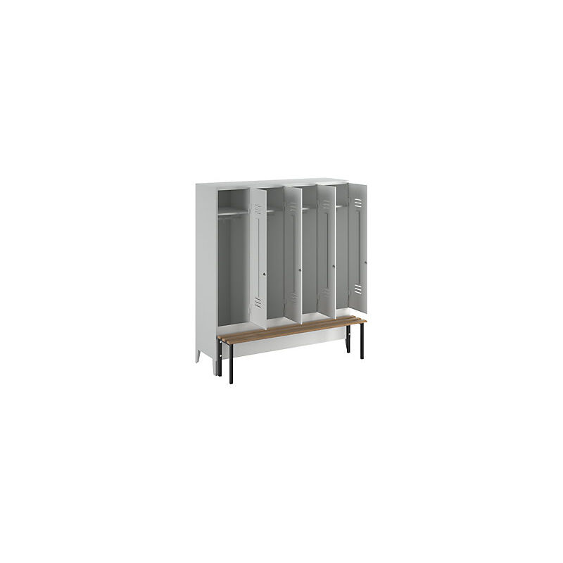 Armadietto guardaroba con panca anteriore, ante piene, larghezza scomparti 400 mm, 4 scomparti, grigio chiaro. Fornitura = montato. Altezza = 1850 mm. Larghezza = 1600 mm. Profondità = 805 mm. Colore corpo = grigio chiaro RAL 7035. Colore porta = grigio chiaro RAL 7035. Serratura = chiavistello girevole. Numero scomparti in larghezza = 4 pz. Materiale = lamiera d'acciaio. Larghezza scomparti = 400 mm. Profondità scomparti = 500 mm. Dotazione interna = 1 cappelliera, 1 asta appendiabiti con 4 ganci. Altezza sedile = 415 mm. Profondità sedile = 300 mm. Altezza piedini = 150 mm. Altezza armadio = 1850 mm. Profondità armadio = 500 mm. Tipo di porta = ante piene. Colore doghe = faggio. Colore telaio = nero notte RAL 9005. Serie = BERLIN. Larghezza interna = 398 mm. Altezza interna = 250 / 1420 mm. In robusta lamiera d'acciaio saldata, con rinforzo. Con panca anteriore e ante ridotte. Chiavistello girevole predisposto per lucchetto (diametro staffa 6 - 8 mm max). Portatarghette, alt. x
